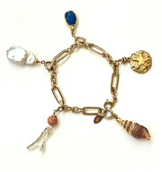 Elevate your accessory game with our Bordeaux Bracelet and Starter Charm Set, featuring charming and elegant resort-themed charms. The set includes a baroque flat pearl, gilded lapis, spiral seashell, gilded sandollar, and Swarovski coral branch with coral pave bead, all of which are detachable for versatility. Coordinating Bordeaux Chain available.