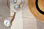 There's something calming and inspiring about wearing shell jewelry. Perhaps it reminds of a magical time spent during a summer. Our Nautilus Pendant is a statement piece you'll want to travel with every year. Edged in 24K gold, accented with fine gold chain and Swarovski crystal. Lobster clasp to attach to chain or slide onto the Hammered Collar.